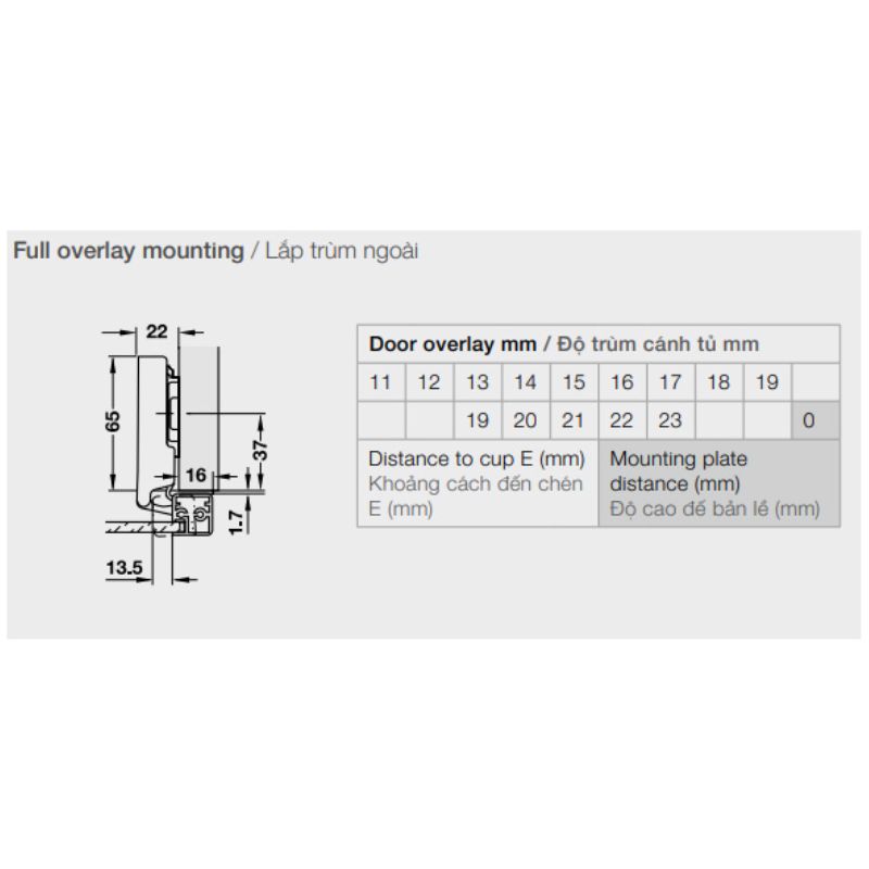 - Bộ phận điều chỉnh: Điều chỉnh chiều ngang ±2 mm, Điều chỉnh chiều cao ±2 mm, Điều chỉnh chiều sâu ±2 mm, 3 chiều, ±2 mm (với đế bản lề phù hợp)