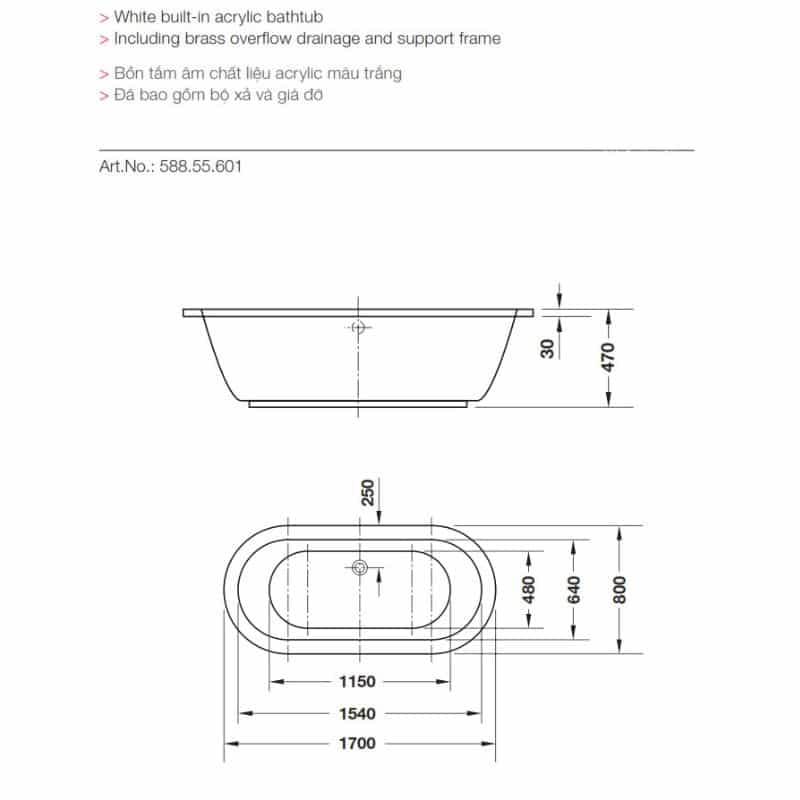 Thông số kĩ thuật của bồn tắm âm Hafele 588.55.601