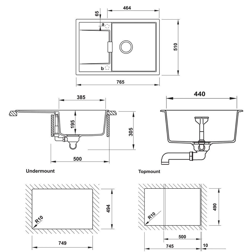 - Kích thước cắt đá nổi: 745D x 490R mm