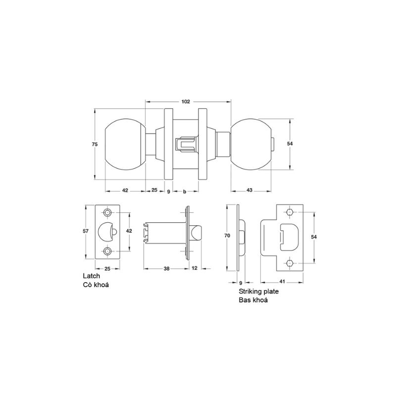 - Trọn bộ gồm : 1 khóa tay nắm tròn, 1 cò khóa, 1 bas khóa, 1 bộ vít, 1 hướng dẫn lắp đặt
