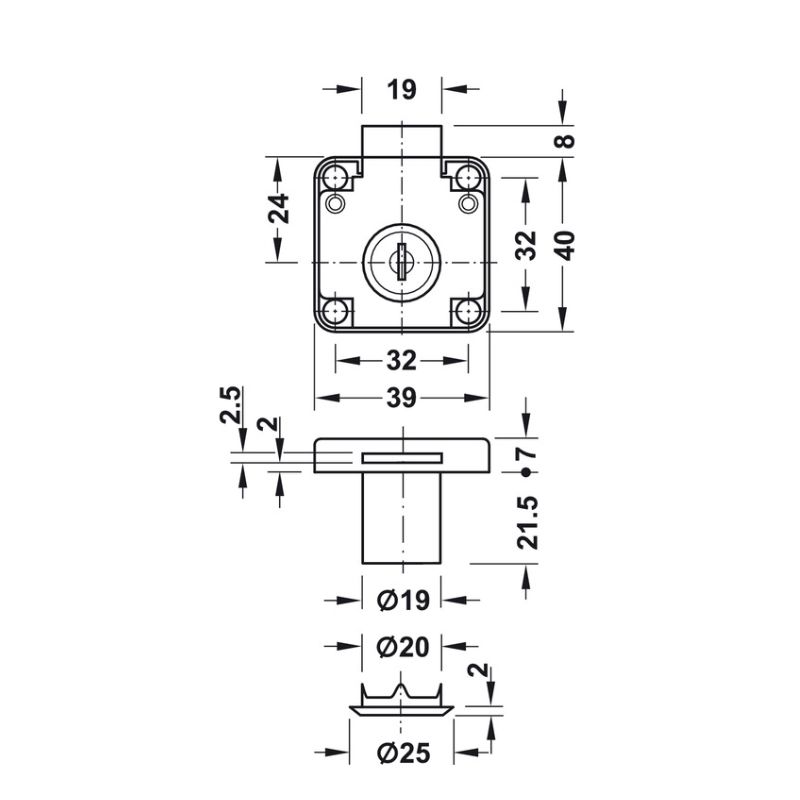 - Khóa vuông then gài cố định, với lõi chìa lõi trơn, khoảng cách từ cạnh cửa đến tâm lỗ ruột khóa 24mm